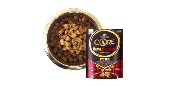CORE dry dog food topped with CORE Bowl Boosters PURE 100% Beef